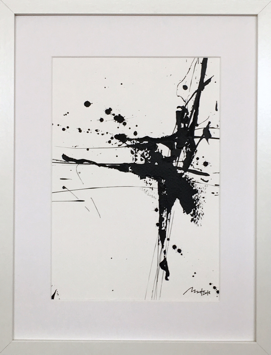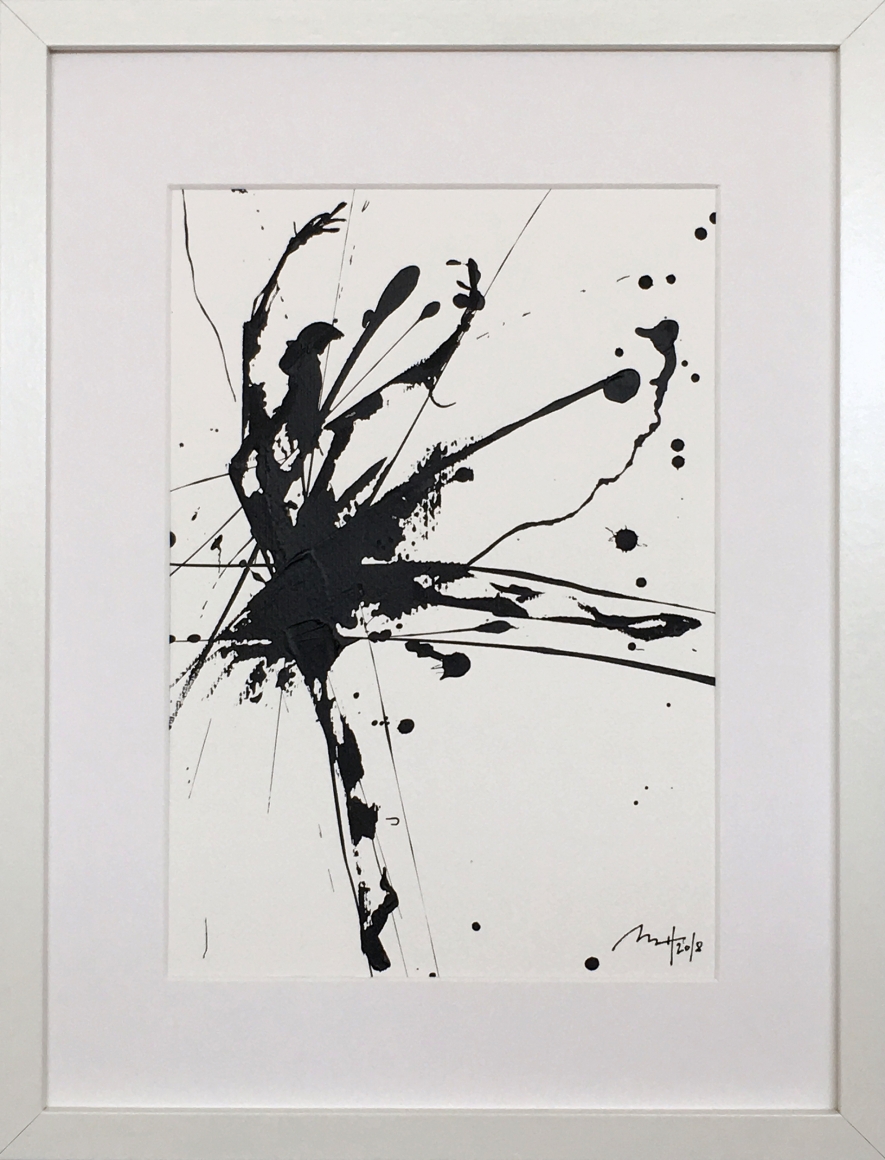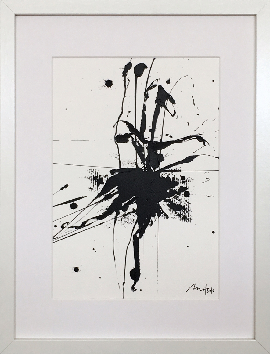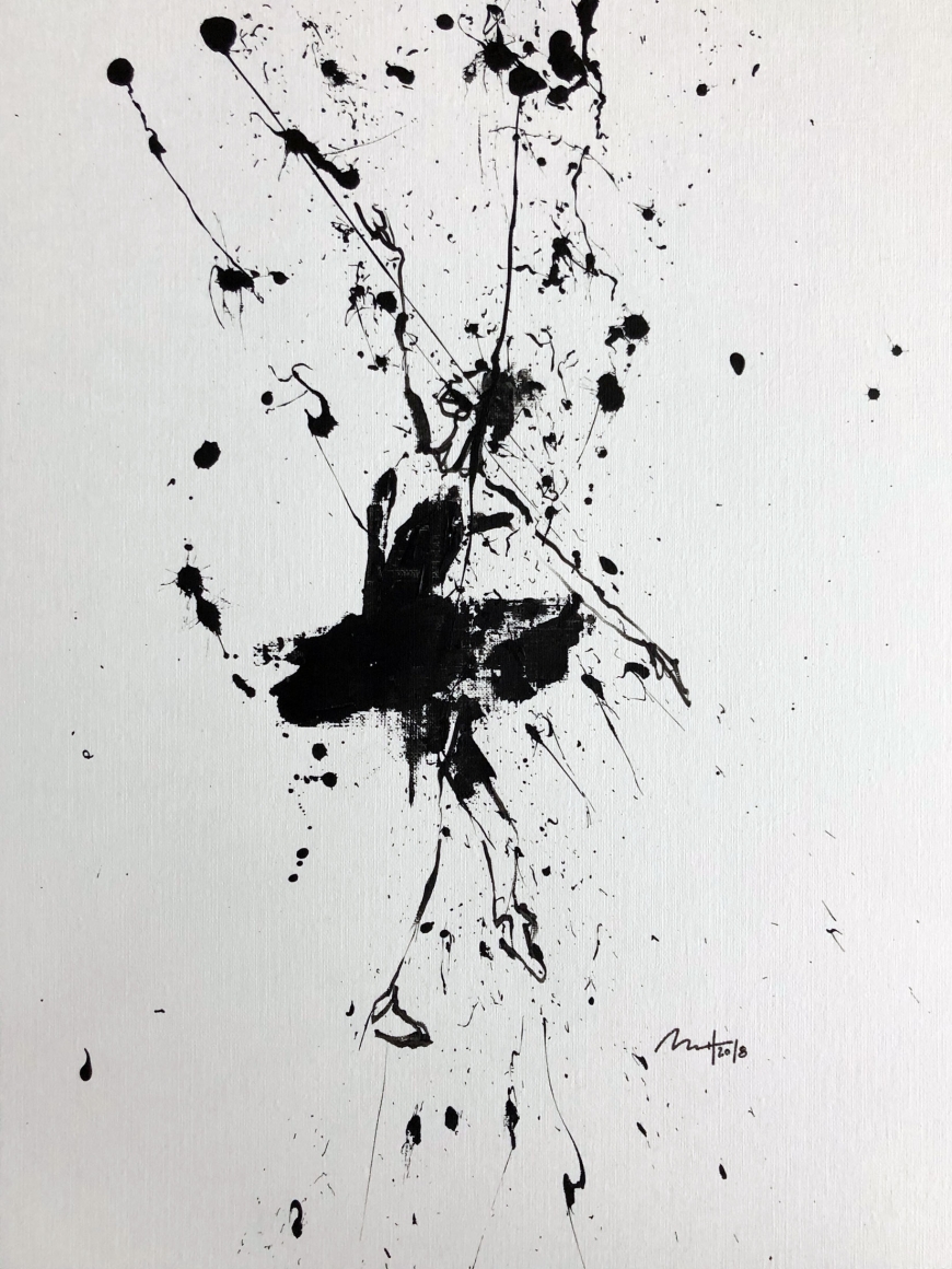 Making use of uncommon and “rough” materials, like cardboards, reversed canvases and hardware tools, he paints abruptly and spontaneously. His approach relies on drippings, splashes and paint throws, so that the physicality of the painting process is transparent in the final piece.